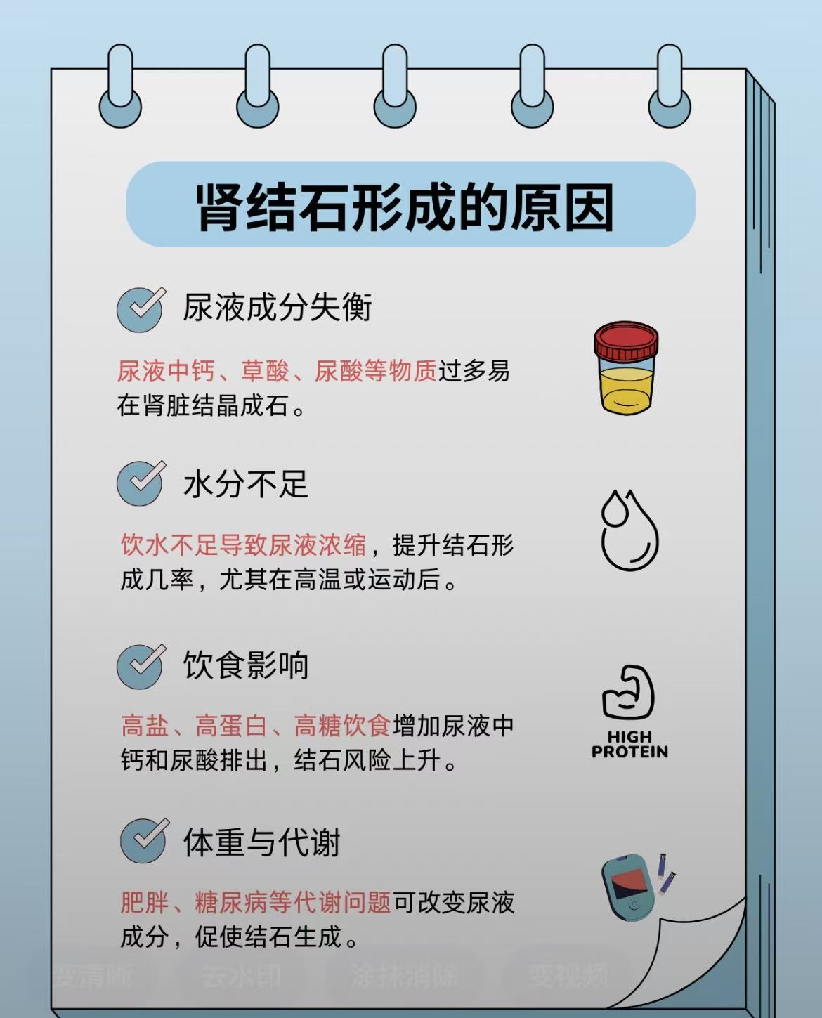 · 后果:肥胖常伴随胰岛素抵抗,这会改变尿液的酸碱度,并增加尿钙排泄,是结石形成的独立危险因素。